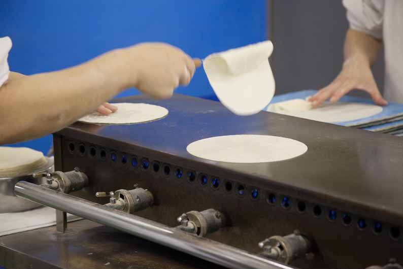 ↑ まず、生地はプレスで薄くするのではなく、ローラーを通して何方向からも伸ばしています。