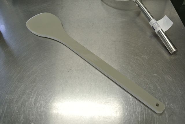 カタログによると「従来の木製スパテラは欠ける・焦げる・ひび割れする、或いは削れることにより木片が食材に混入する恐れがあり、衛生管理上の最大の問題点でした。超高分子量ポリマーUMSP製を使用することによりそれを解消しました」ということです