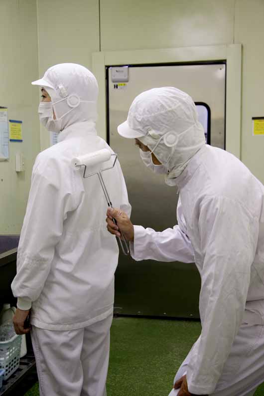 エアーシャワー室に入り、服に付着しいているホコリを取り除きます。
