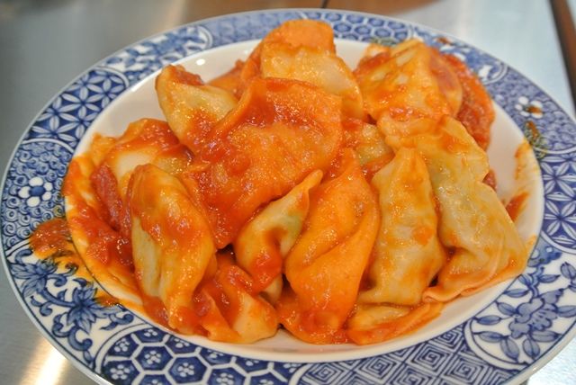 フライパンにトマトソースを入れ、その中に茹でた水餃子を入れてを和えます。(↓)