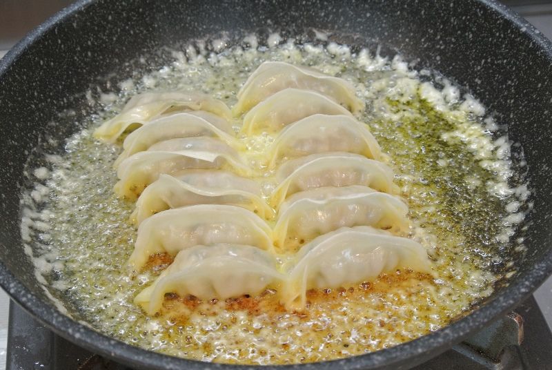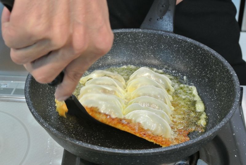 餃子を並べたら水を入れ、フライパンのフタをして蒸し焼きにします。
