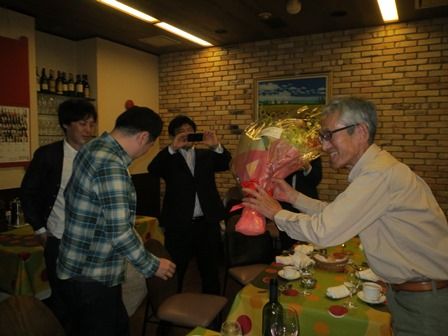 ↑ 食事のあとは先生に花束贈呈