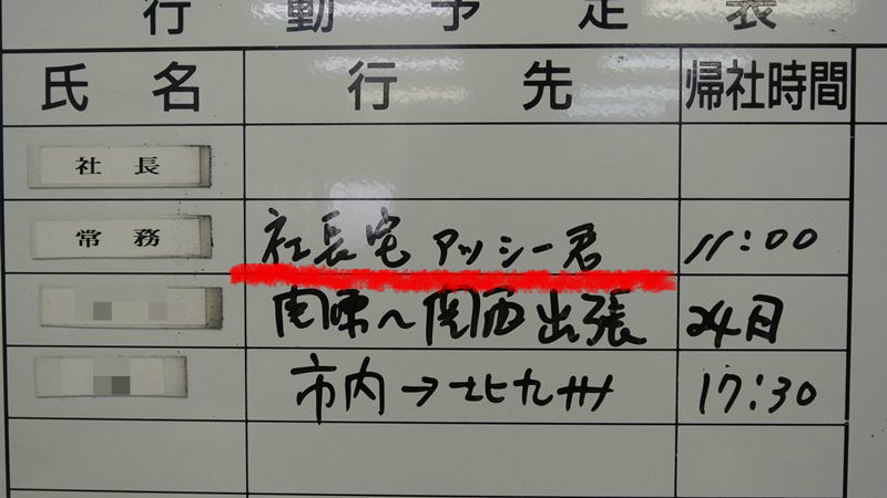 そして階段を無事に上り事務所に入ると、行動予定を書くホワイトボードが目に入りました。