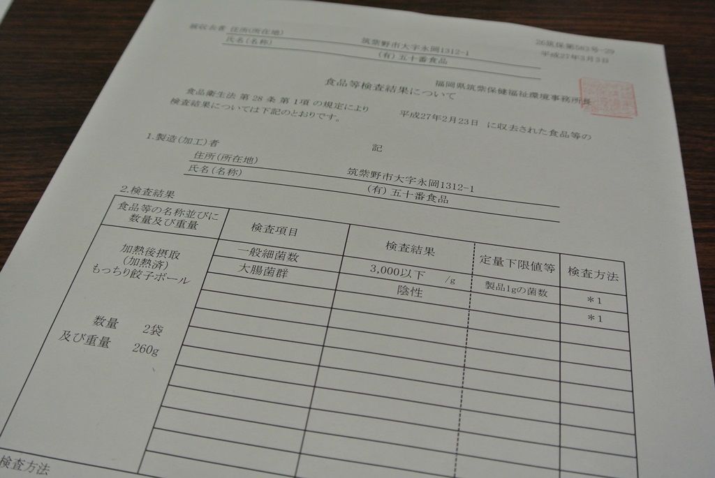 保健所が定期的に食品の菌検査をされていて、今回は新商品の「もっちり餃子ボール」を提出しましたが、一般細菌数も規定数以下、大腸菌群も陰性でした。