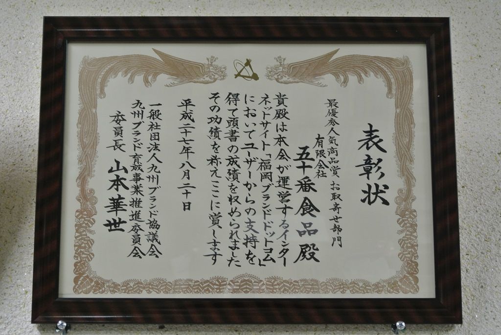 先日のブログでもお伝えしましたが、先週行われた福岡ブランド.comのセレモニーで、五十番食品が「最優秀人気商品賞」をいただくことができました