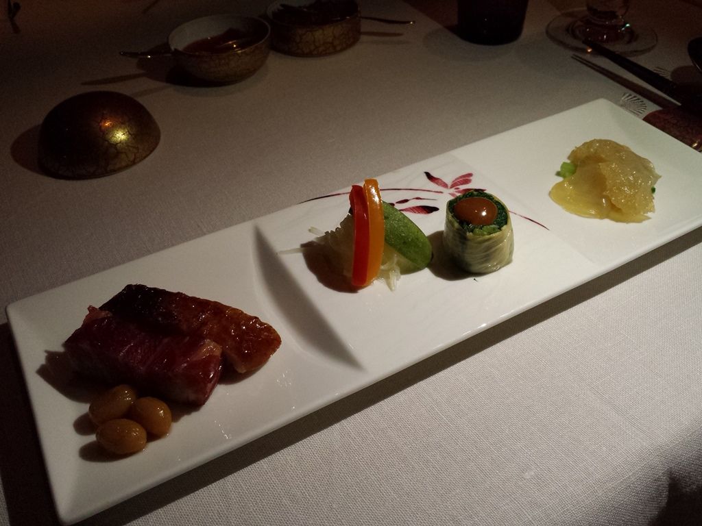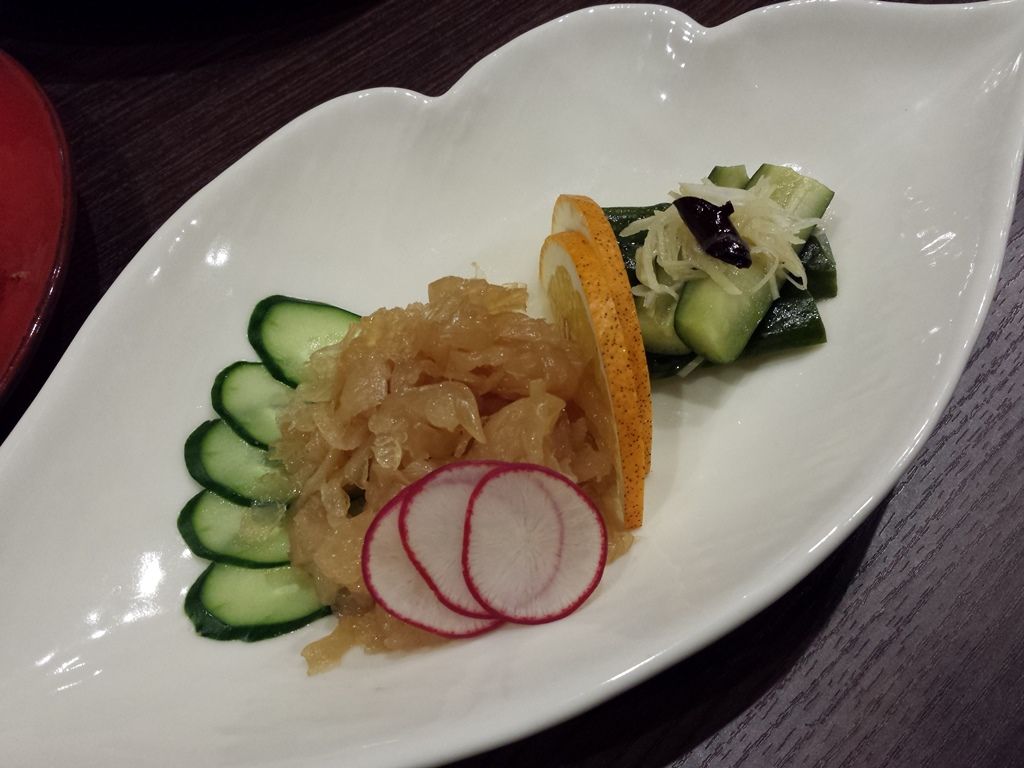 向かって一番右が南方くらげを使った料理、真ん中が春菊を湯葉で巻いたもの、一番左がチャーシューです。