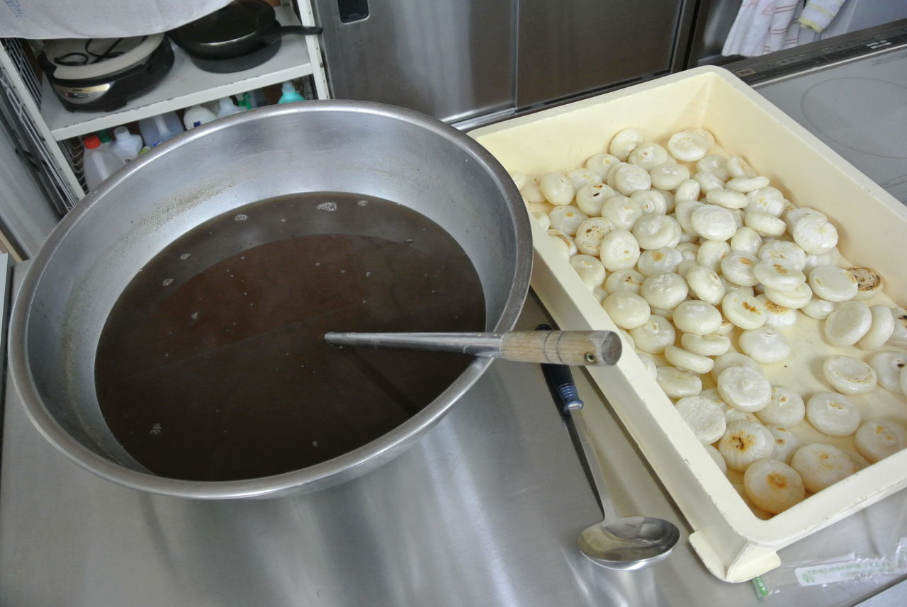 ↑ 工場長と社員のYさんが、大量のぜんざいと大量のお餅を焼いてくれました。