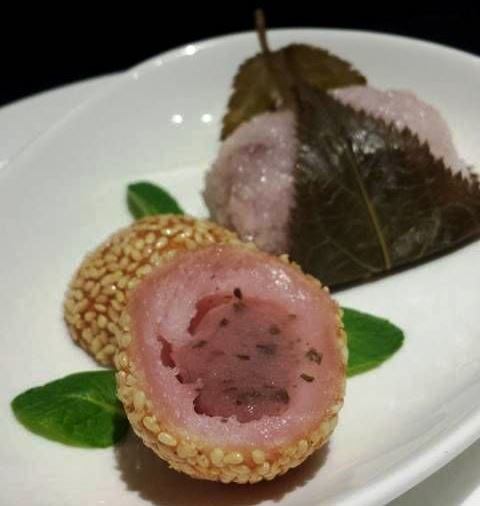 ↑ こちらはお客様からいただいた画像ですが、「芝麻球(桜あん)」を桜餅とセットにして使われたそうです。