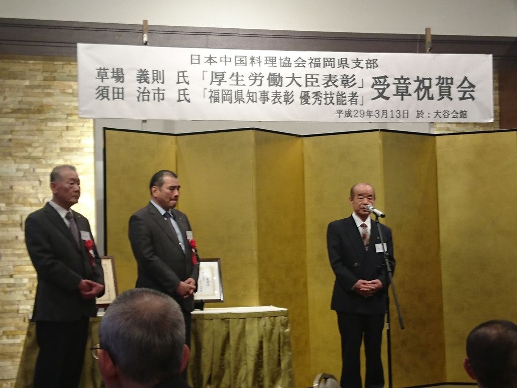 昨日は日本中国料理協会福岡県支部の会員であられます草場義則氏の「厚生労働大臣表彰」と、須田治市氏の「福岡県知事表彰 優秀技能者」の受賞祝賀会が、北九州市八幡東区の大谷会館にて盛大に行われました