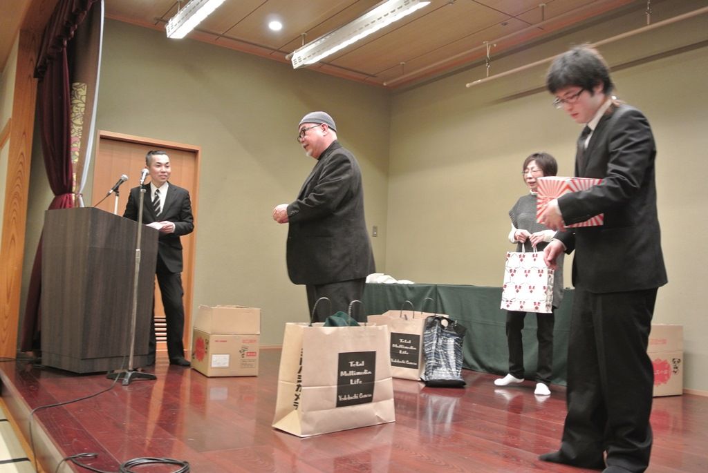 会社にいただいたお土産やお歳暮の品、また私や常務、工場長が身銭を切って買ってきた景品を大放出です