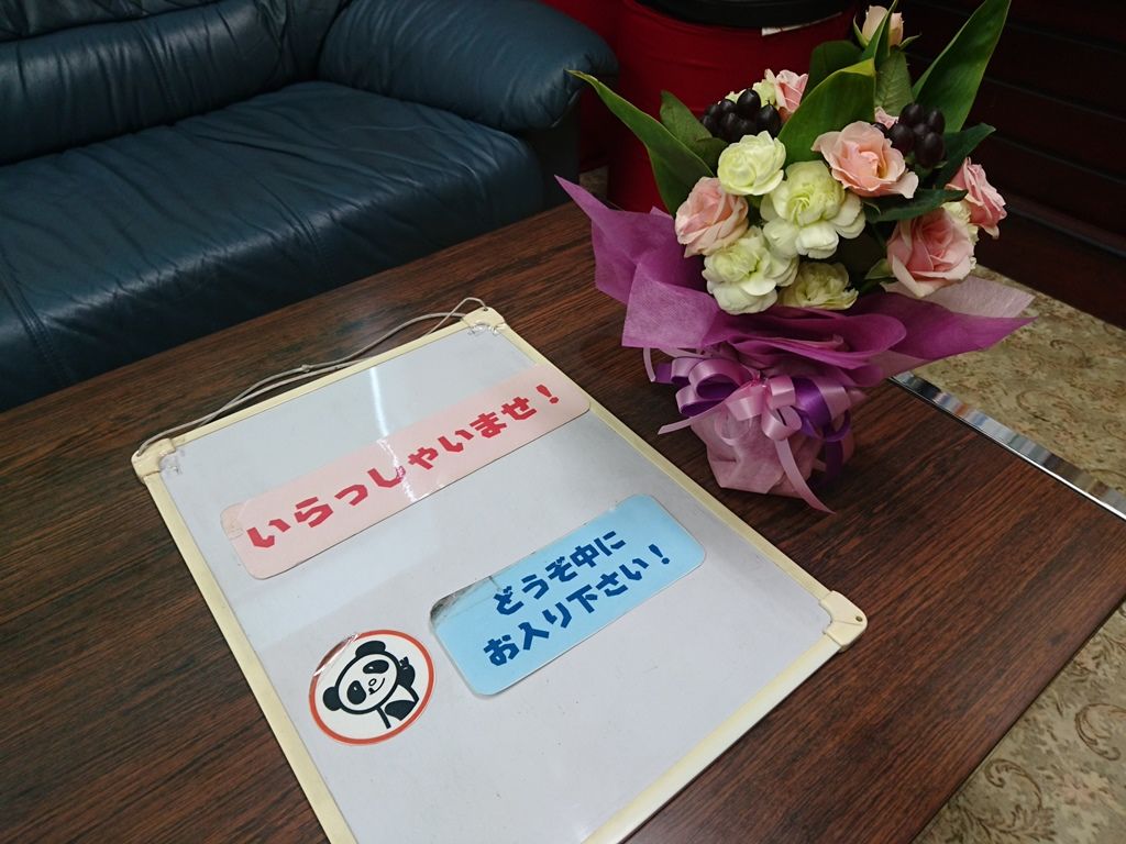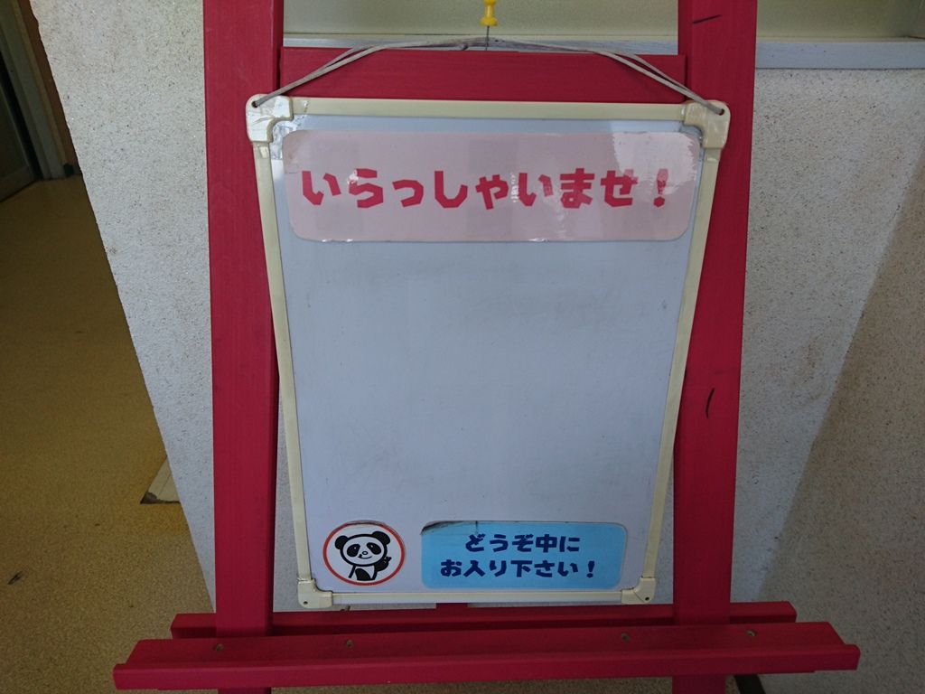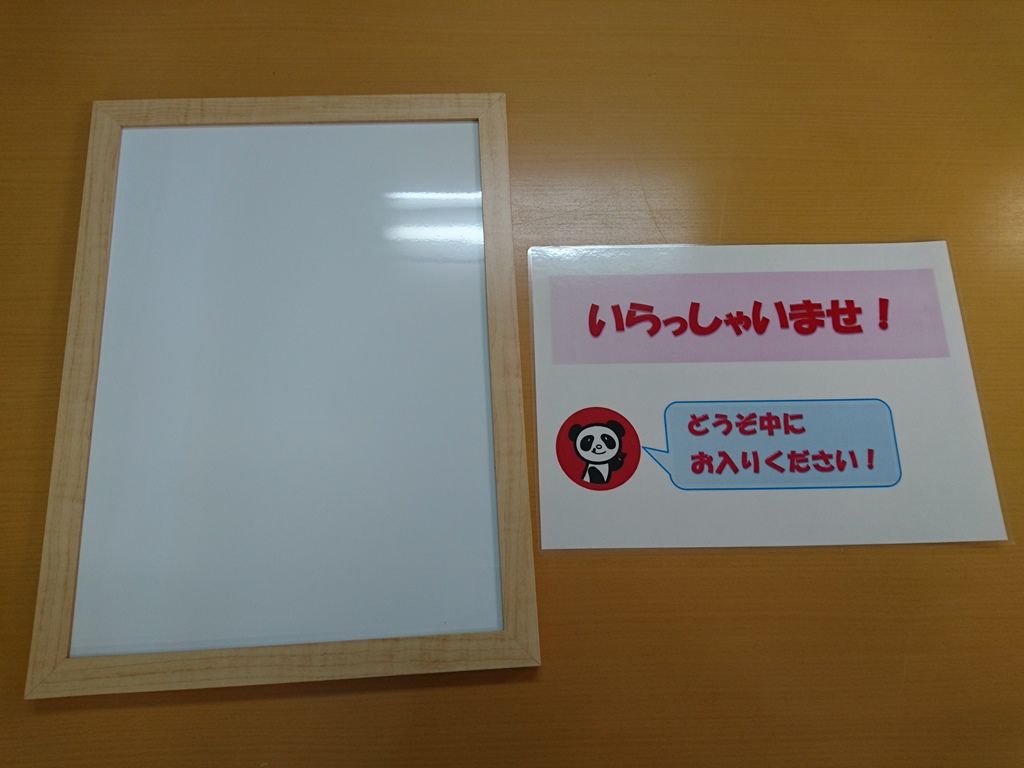 五十番食品の2階の入口ドアを開けてもらうと、ウェルカムボードが置いてあります。