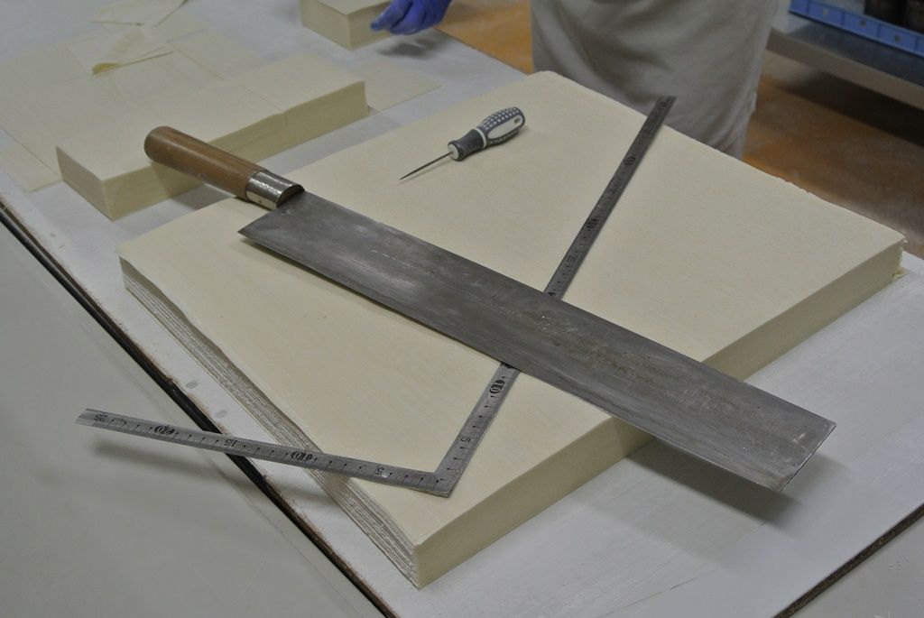 そして千枚通しでつけた印の通りに大きな包丁で切っていきます。
