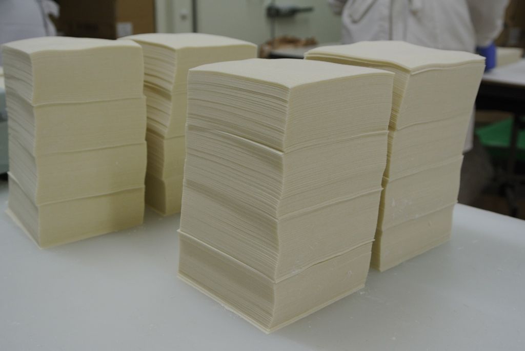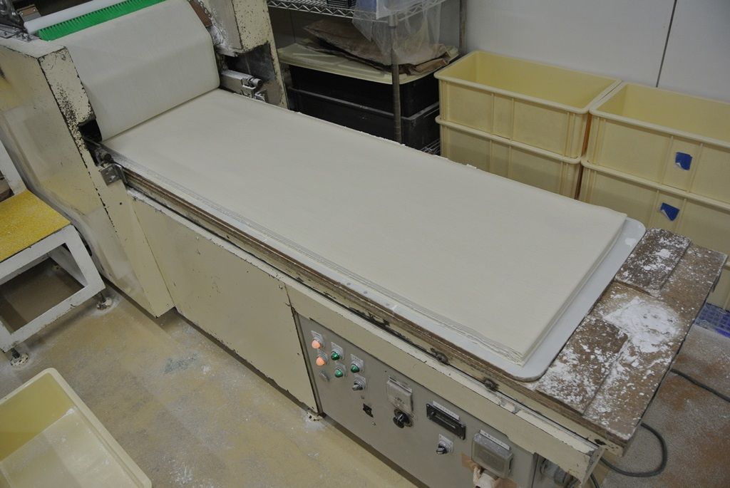 まずワンタン皮は、麺帯自動折畳機という機械で、長い帯状になり何重にも重ねられます。