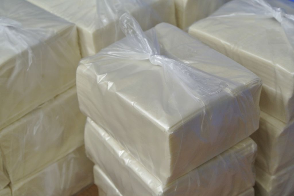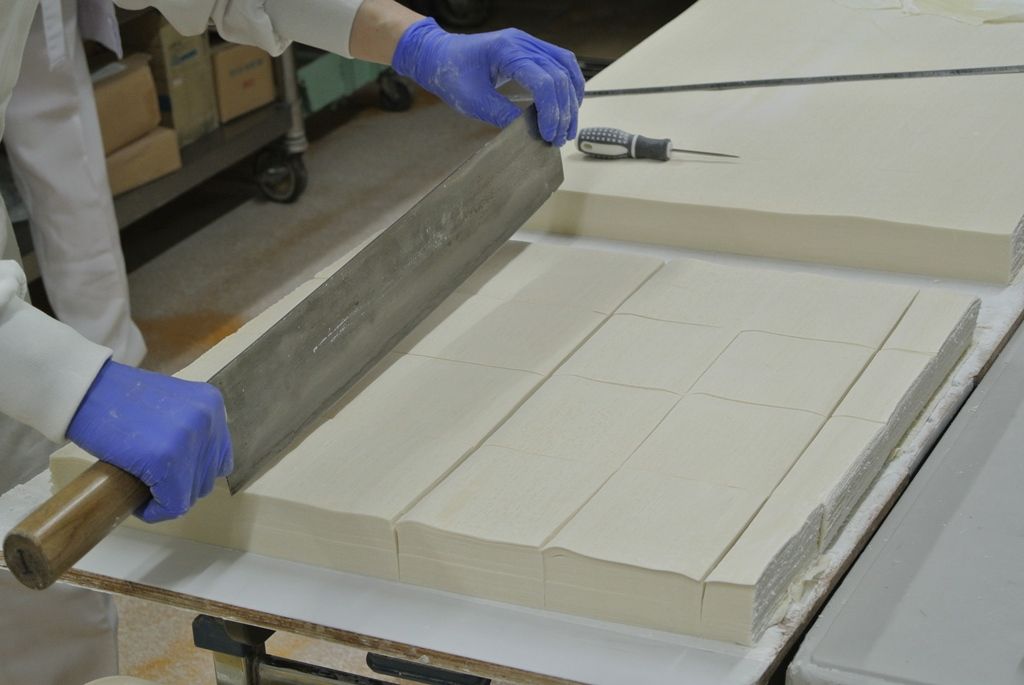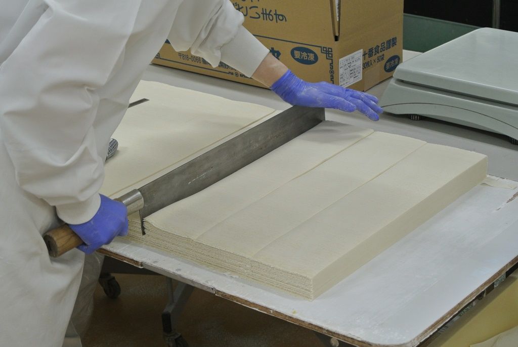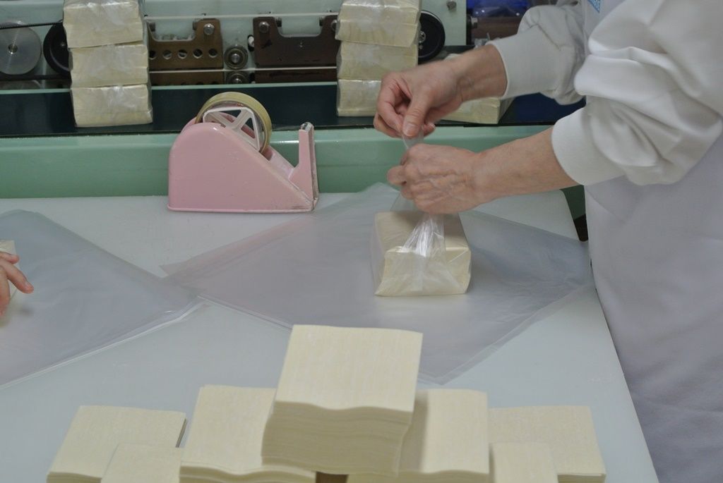 そして、四角に切ったものは既定の重さに計量をして、透明なビニールで包んでいきます。