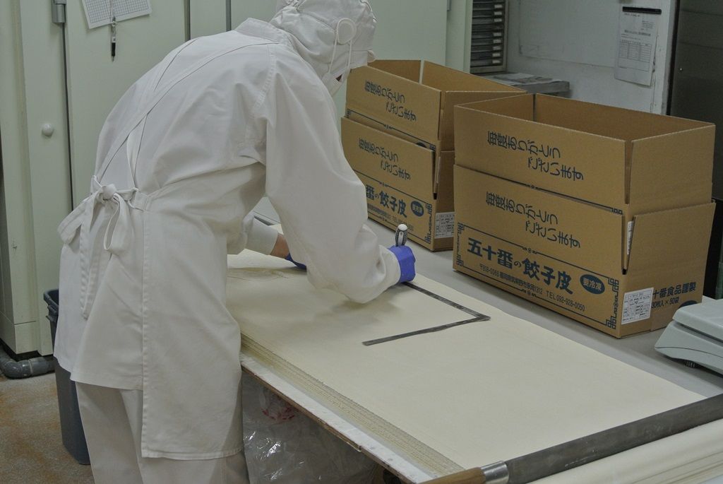 ワンタンの皮に限らず、四角い焼売の皮も、同じように手作業で四角に切っています