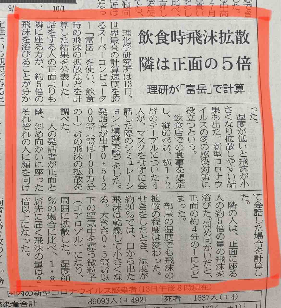 今日の日経新聞に「飲食時飛沫拡散 隣は正面の5倍」という記事が載っていました。