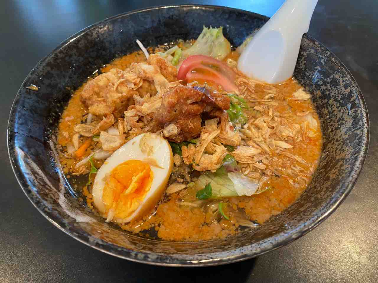 トッピングにはレタス・トマトなどの野菜に、揚げ卵に、唐揚げが2つ。