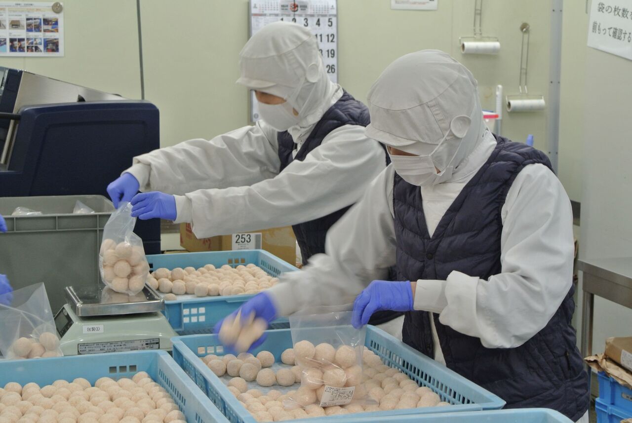 ↑ 冷凍されたごまだんごを、20個ずつ袋に入れていきます。
