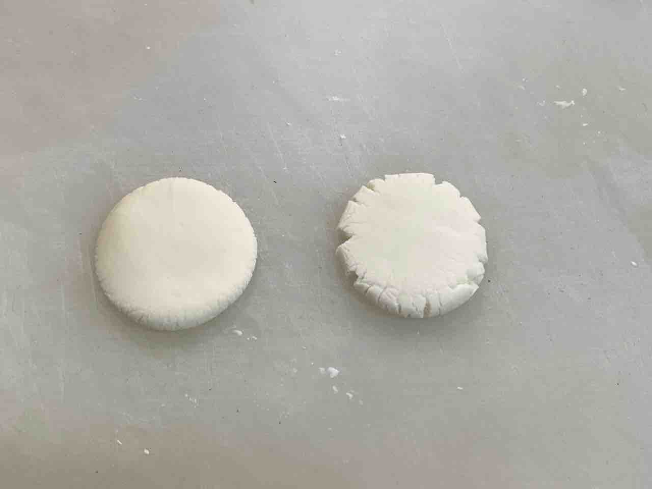 皮を丸めて平たくつぶしてみると、右側は横が干割れしますが、左側はしっとり滑らかです。