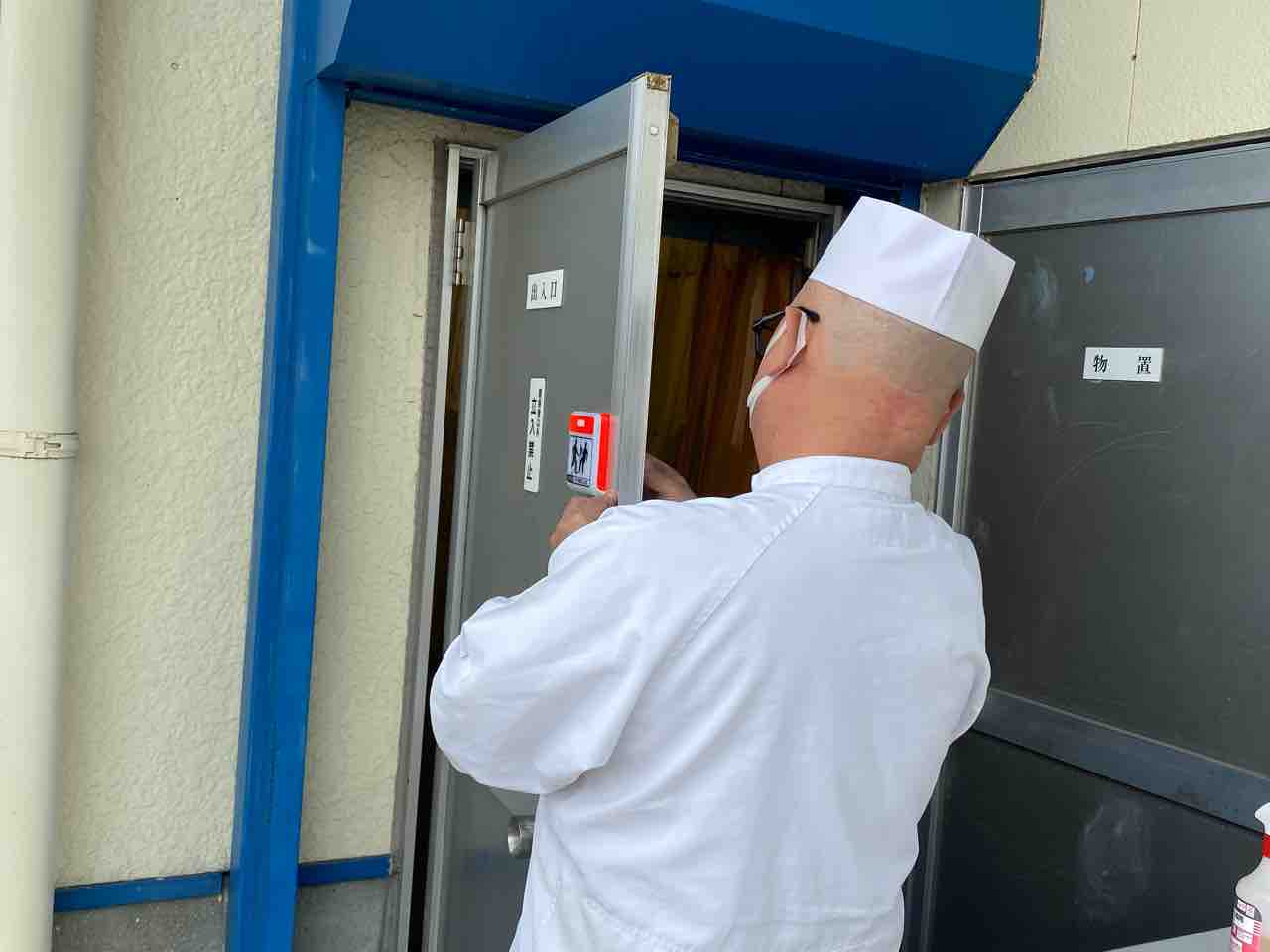 五十番食品の工場は、定期的に産業医の先生に巡視してもらい日々労働災害防止に努めていますが、今月の巡視でドアの開閉時の衝突の危険性の指摘があり、すぐに衝突防止ライトを取り付けました。