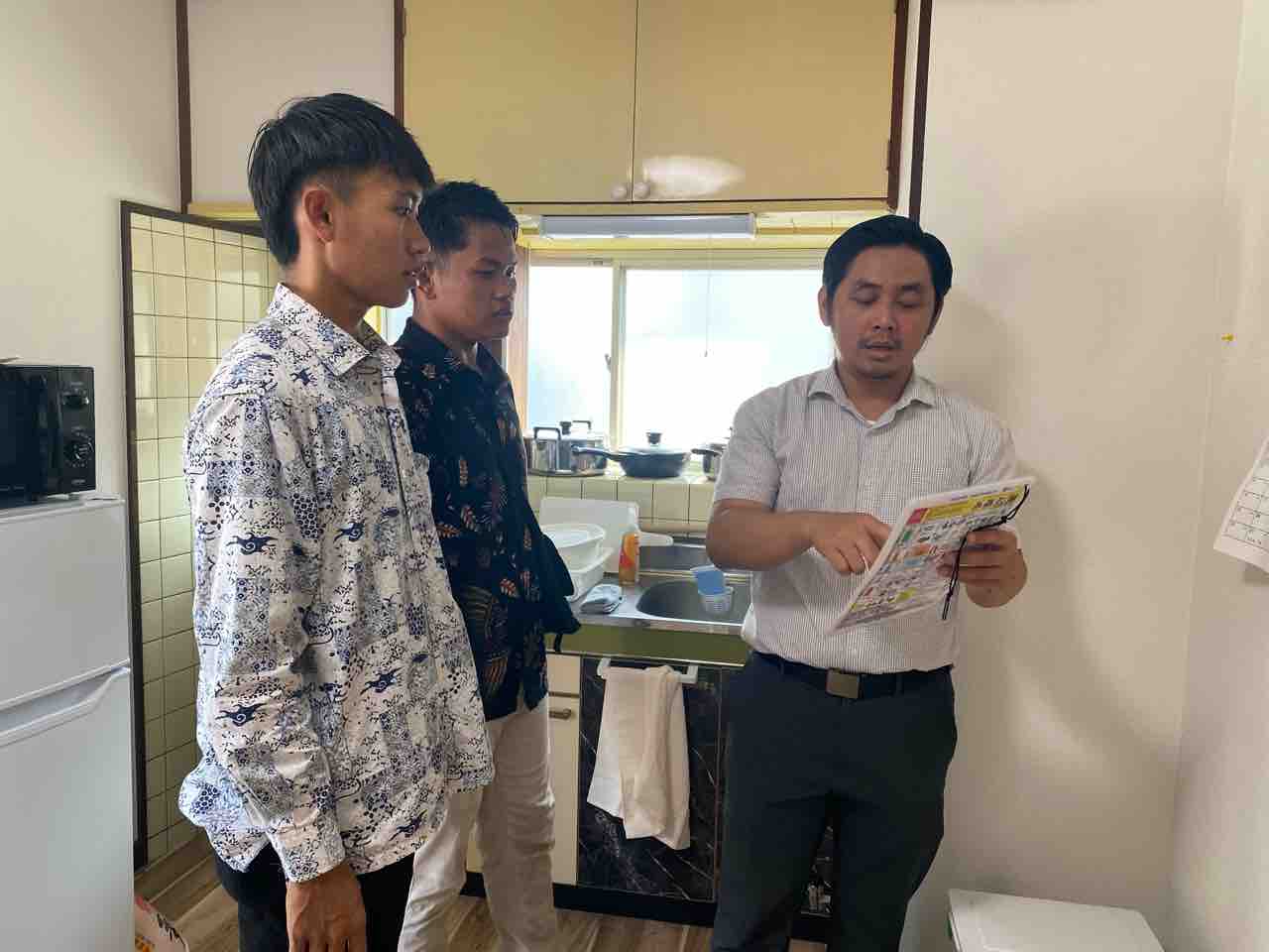 監理団体の通訳の方と一緒に、ガスコンロの使い方や、電子レンジの使い方、洗濯機の使い方、エアコンの使い方など、あとゴミの捨て方(ここ大事