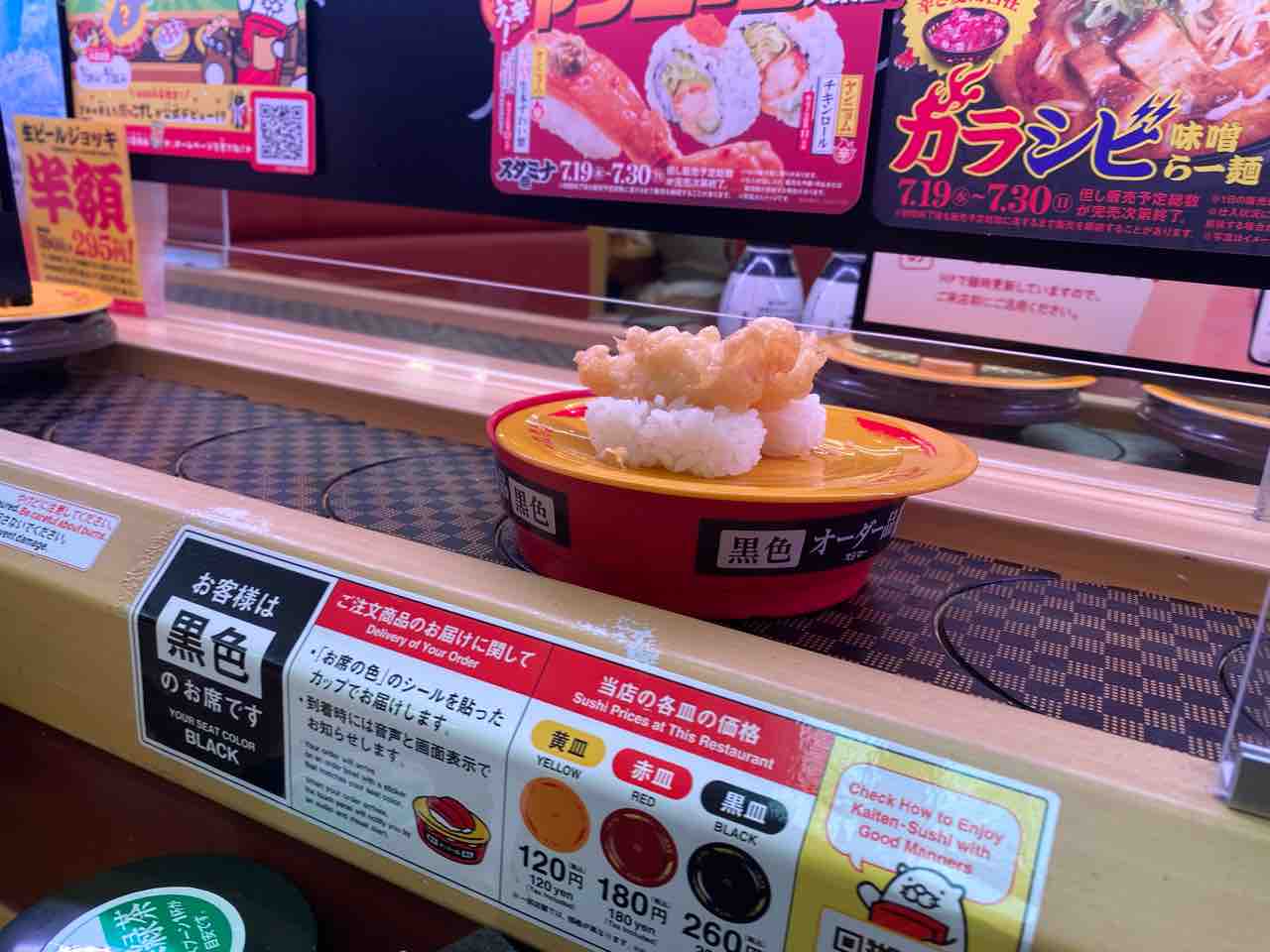 レーンごとに席の色が決められているそうで、黒色と書かれた商品が流れてきた時にそれを取るというシステムでした。