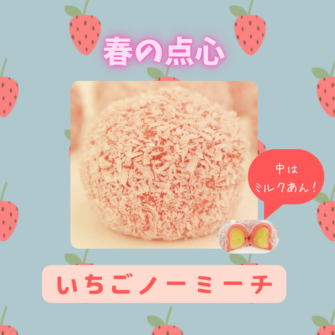 いちごノーミーチは、いちご風味の求肥の中にミルクあんが入っていて、外側にはココナッツファインをまぶしています。