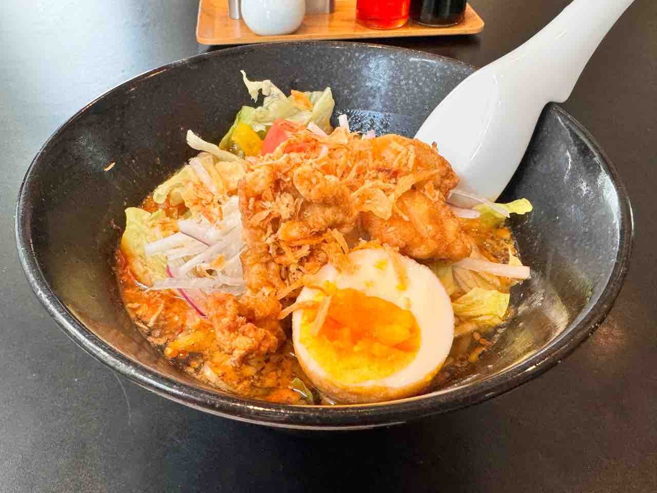 胡麻風味のすっぱ甘いスープに、たっぷりの野菜と豚肉のから揚げと揚げ玉子がのっています。