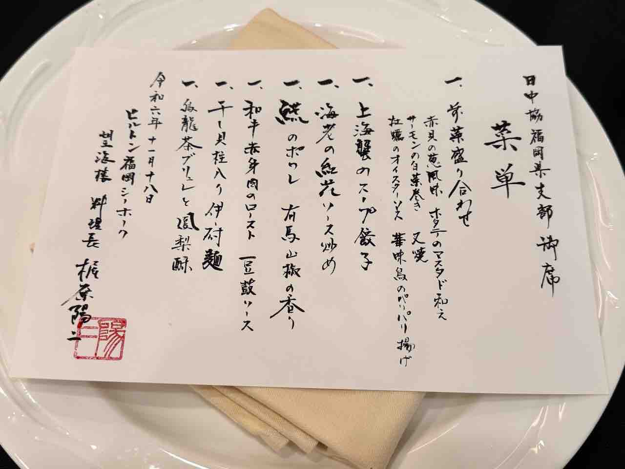 が、料理を食べる前に、料理長直筆の菜単のあまりの字のキレイさにびっくり