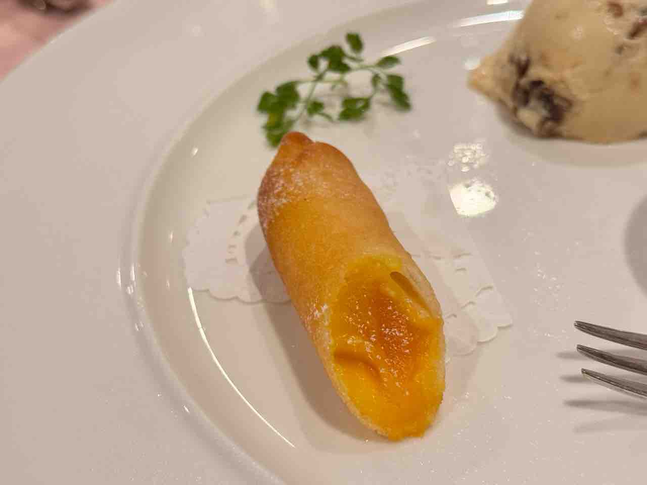 料理長に作り方を聞いたところ、マンゴーノーミーチを解凍して細長く伸ばし、それを春巻皮に包んで揚げたそうです。