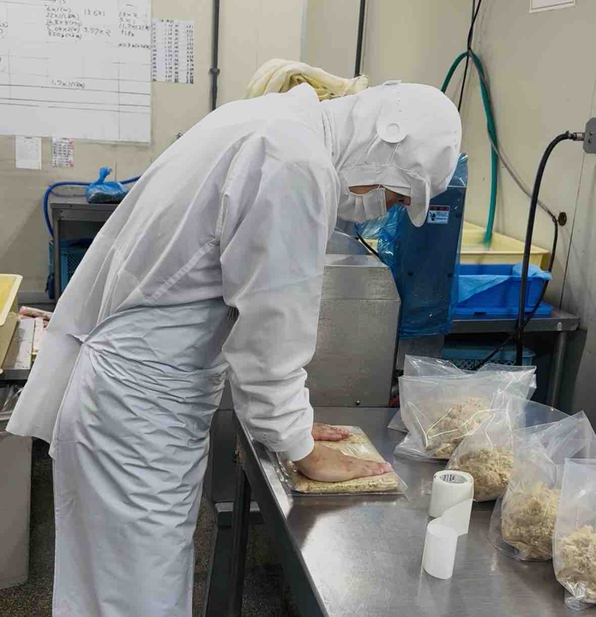一袋一袋、手作業で平べったくしています