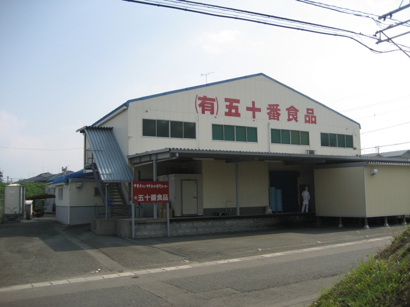 この青い屋根の建物が福岡県筑紫野市にある五十番食品の工場です。1階が工場で2階に事務所があります。