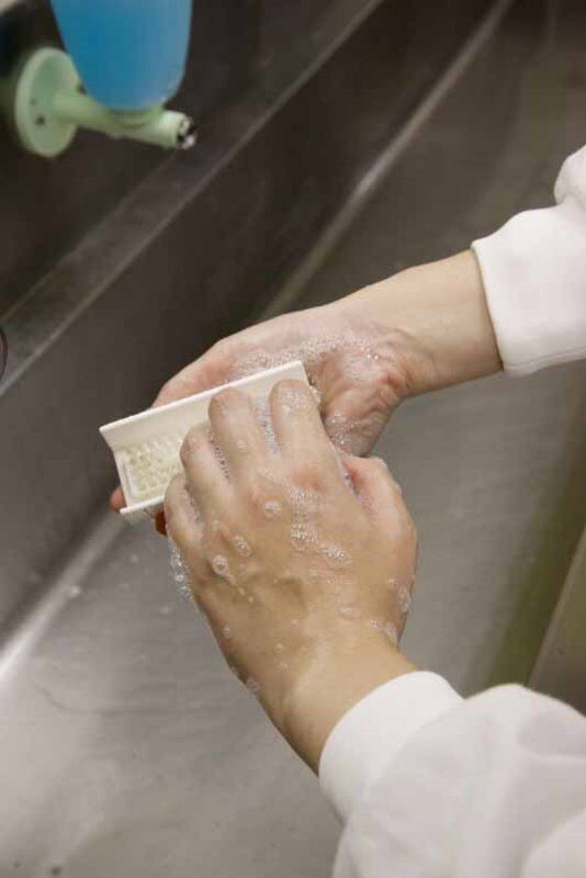 石鹸と爪ブラシを使い、30秒間念入りに洗います。