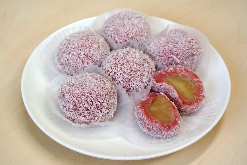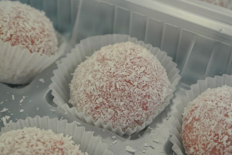 ココナッツをまぶしたものを、ひとつひとつトレーの中に入れていきます。(↓)