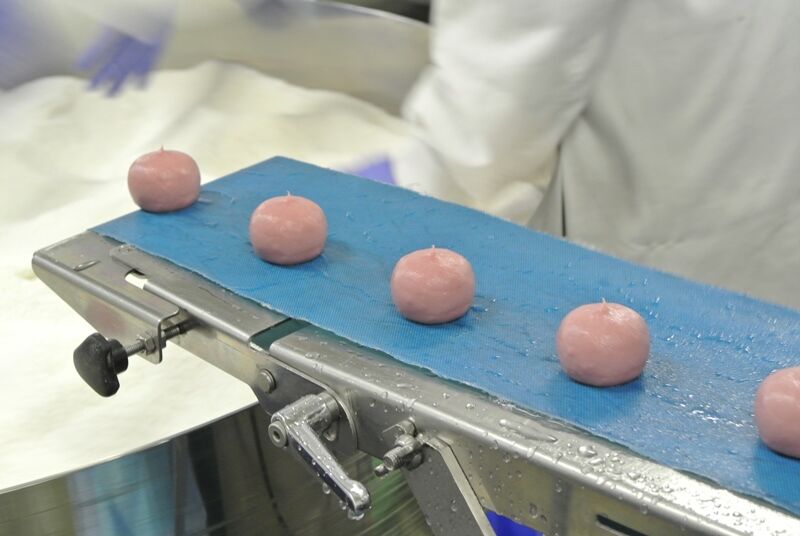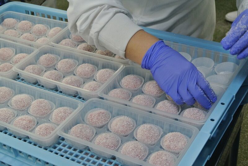 ↑ あんこが包まれた紫イモノーミーチがレーンで運ばれているところ。