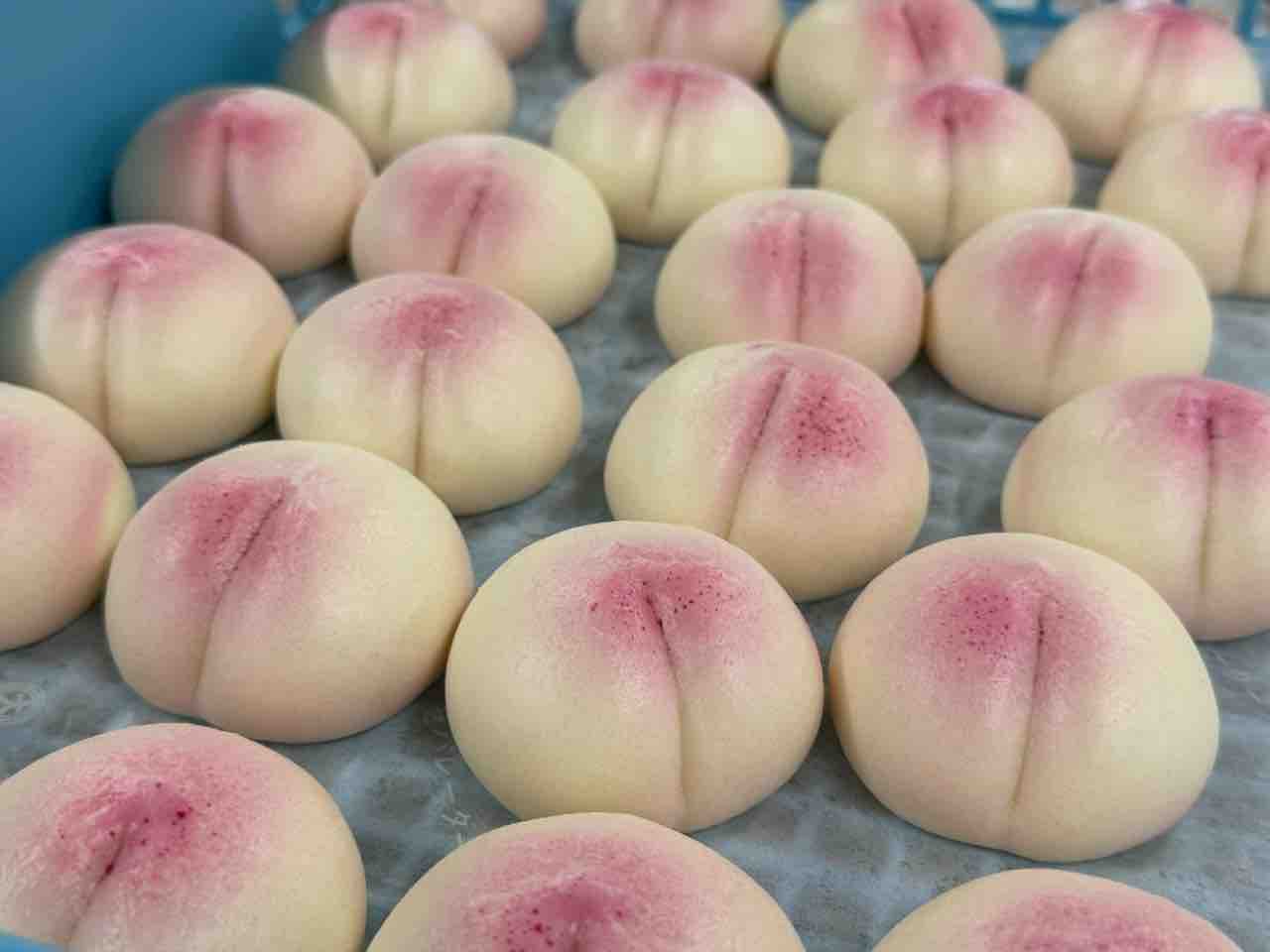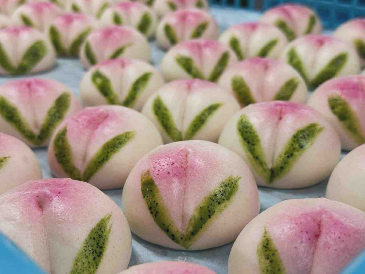 今日は工場で「小寿桃」(桃まんじゅう)を製造しました