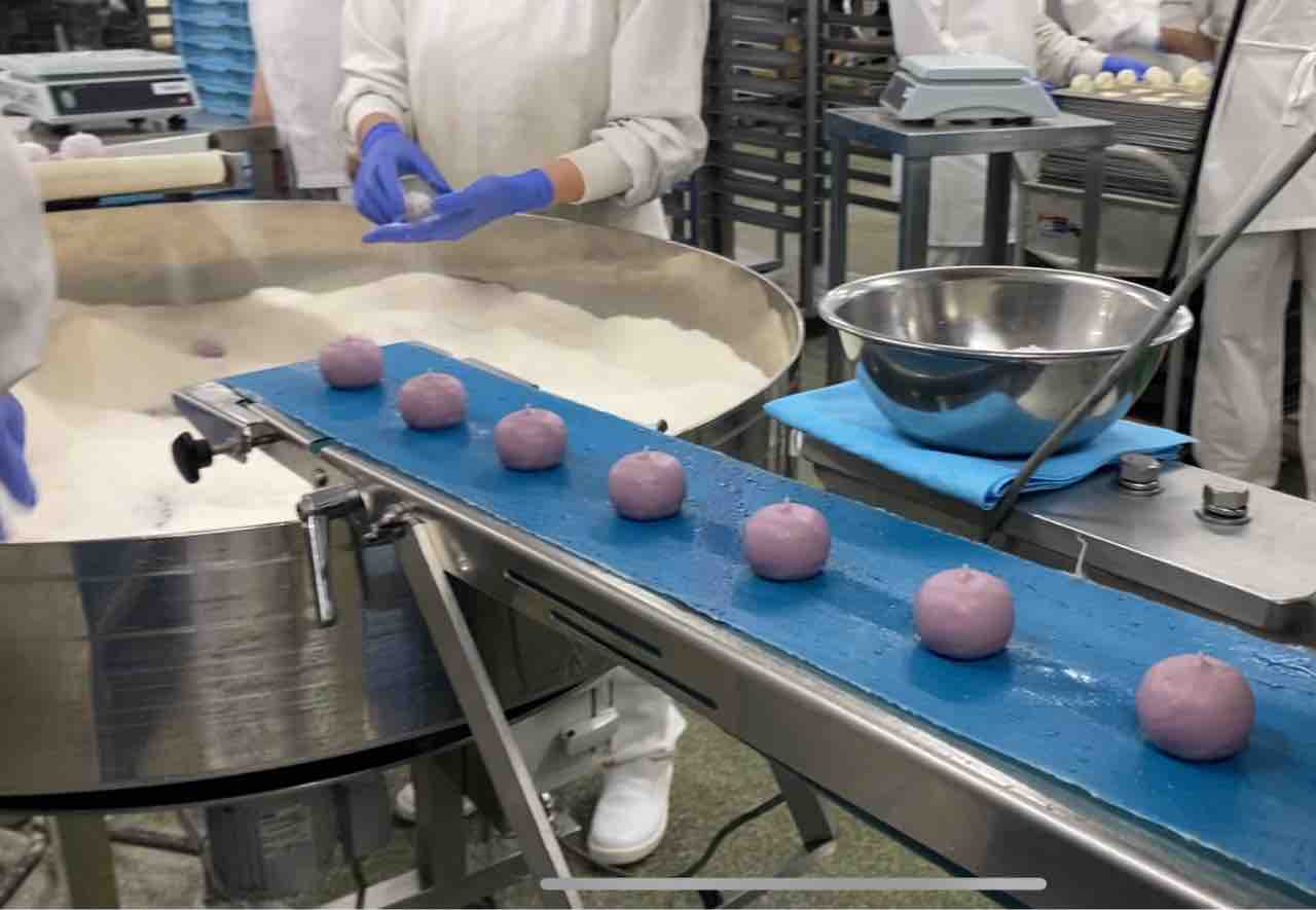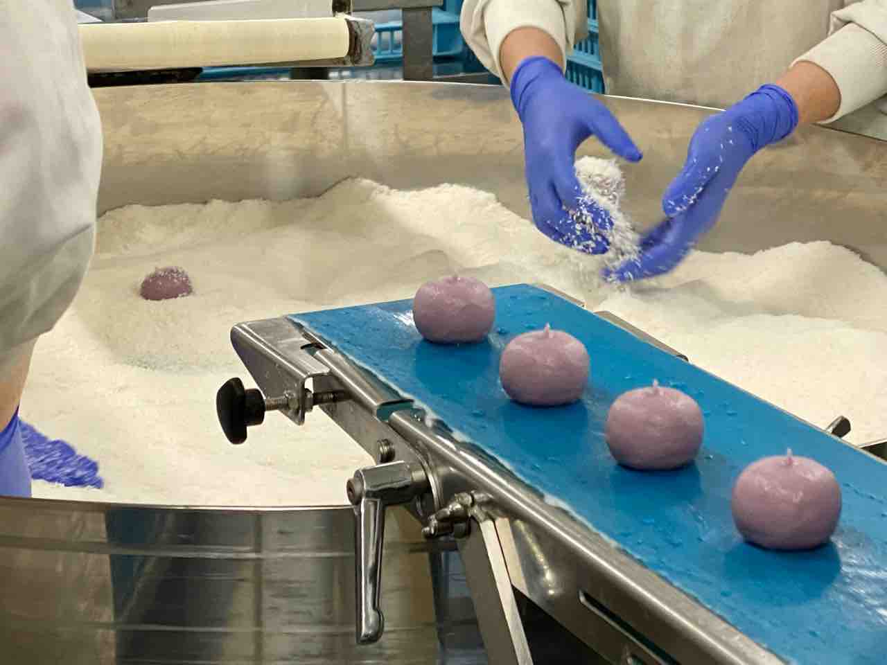 包あんされた団子が、レーンを流れていきます。