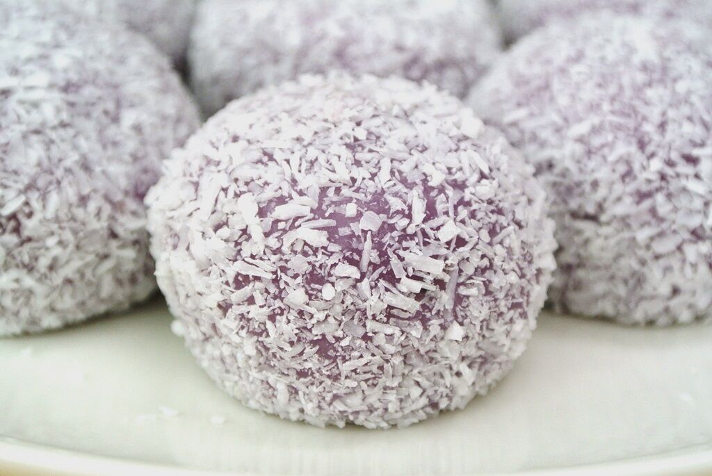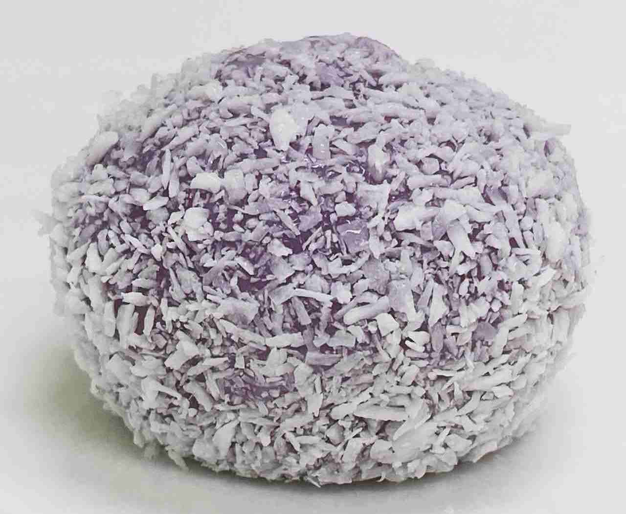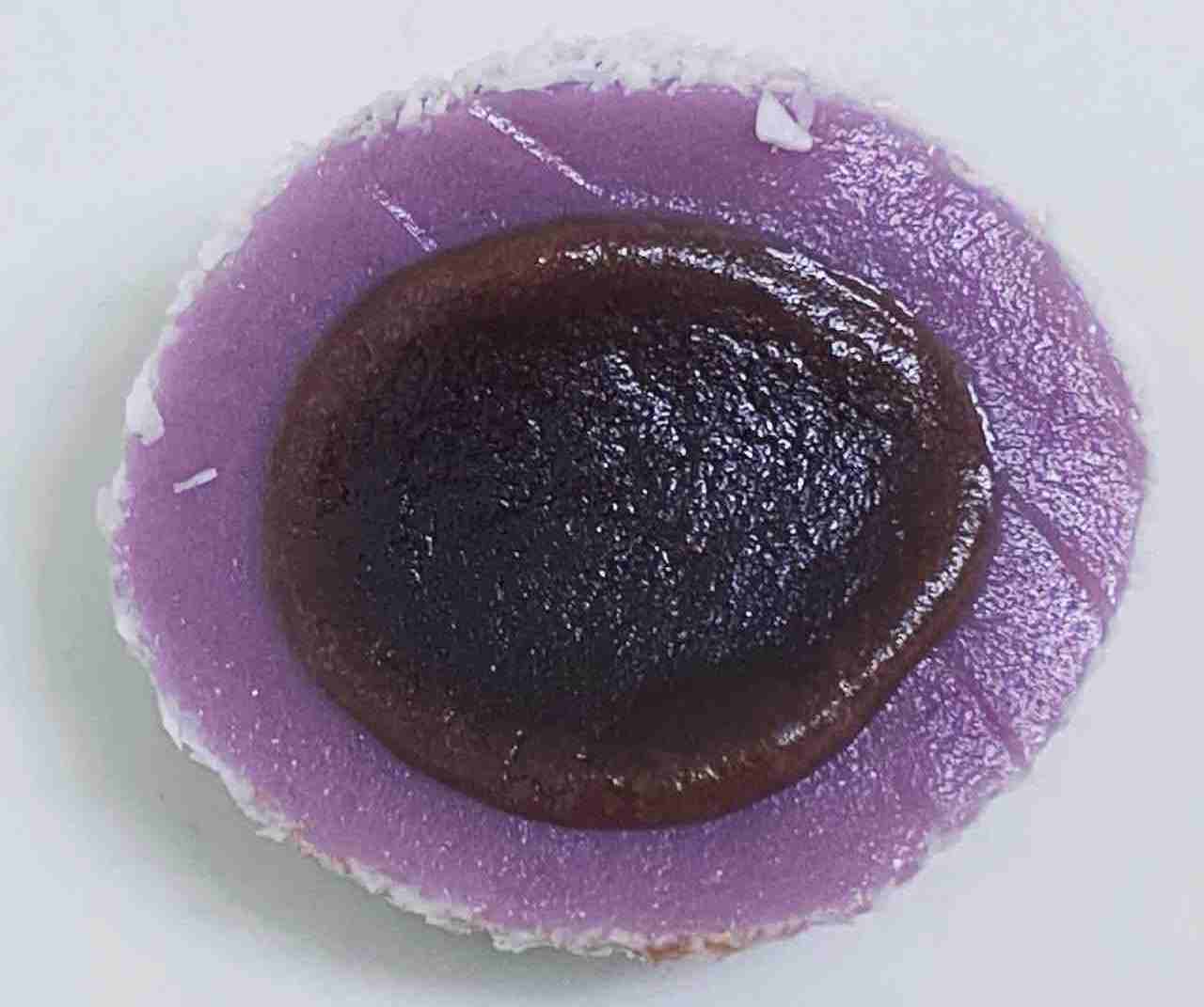 紫イモペーストを練りこんだ餅生地にあんこを包あんしたノーミーチです。