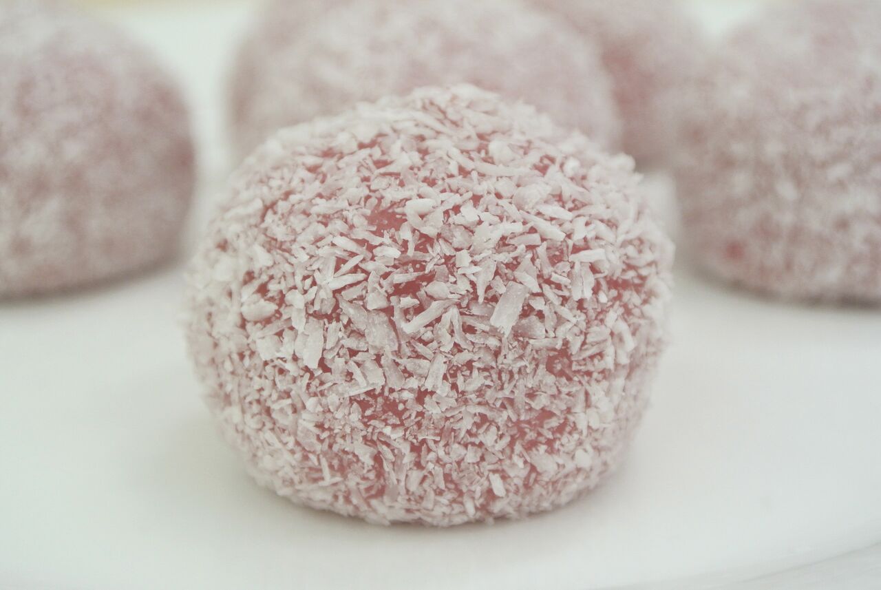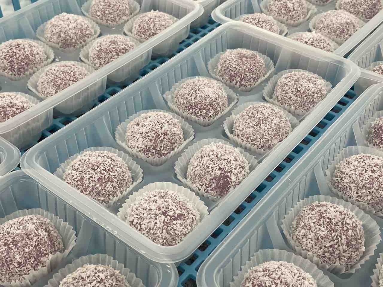 ひとつひとつ手作業でココナッツファインをまぶします。
