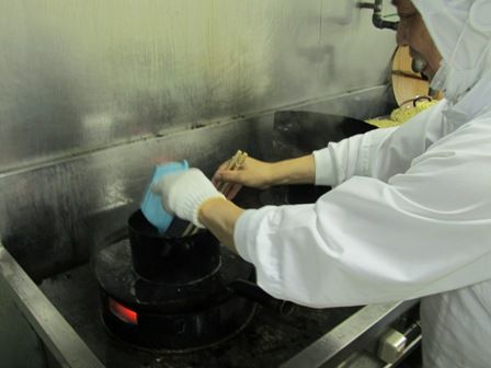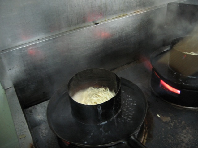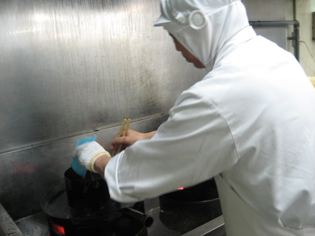 ← 麺を油の中に入れて揚げていきます。伊府麺は、中国人の楊さん担当です