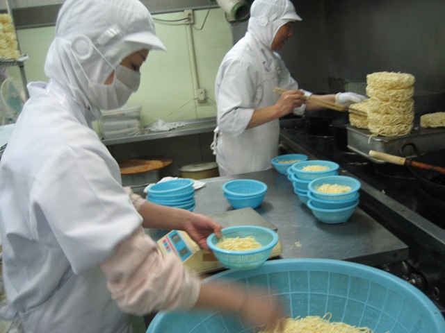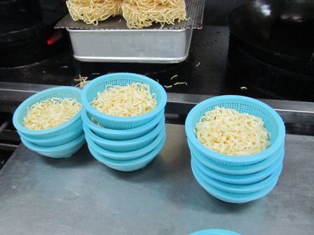 ← まず、麺を既定の重量に量り、「青い」カゴに入れていきます。