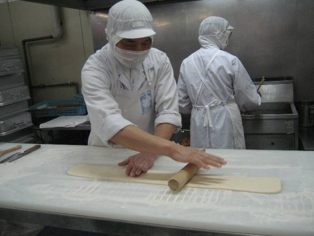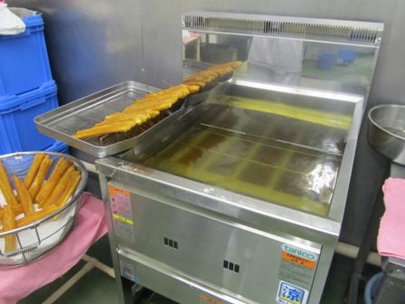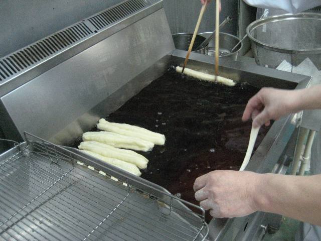 ← 長く伸ばした生地を油の中に入れて揚げます。まっすぐキレイに揚げるのは結構難しいそうです。