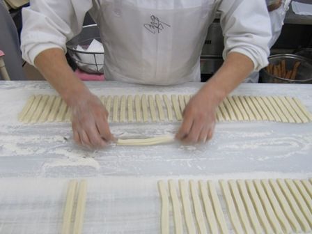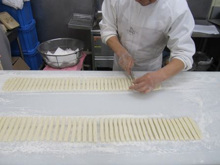 ← まず、長方形に伸ばした生地を包丁で細長くカットします。等間隔にキレイに切っていきます