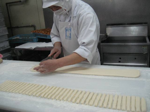 ← 細長く伸ばした生地を、包丁を使って均等の大きさに切っていきます。さすが職人技