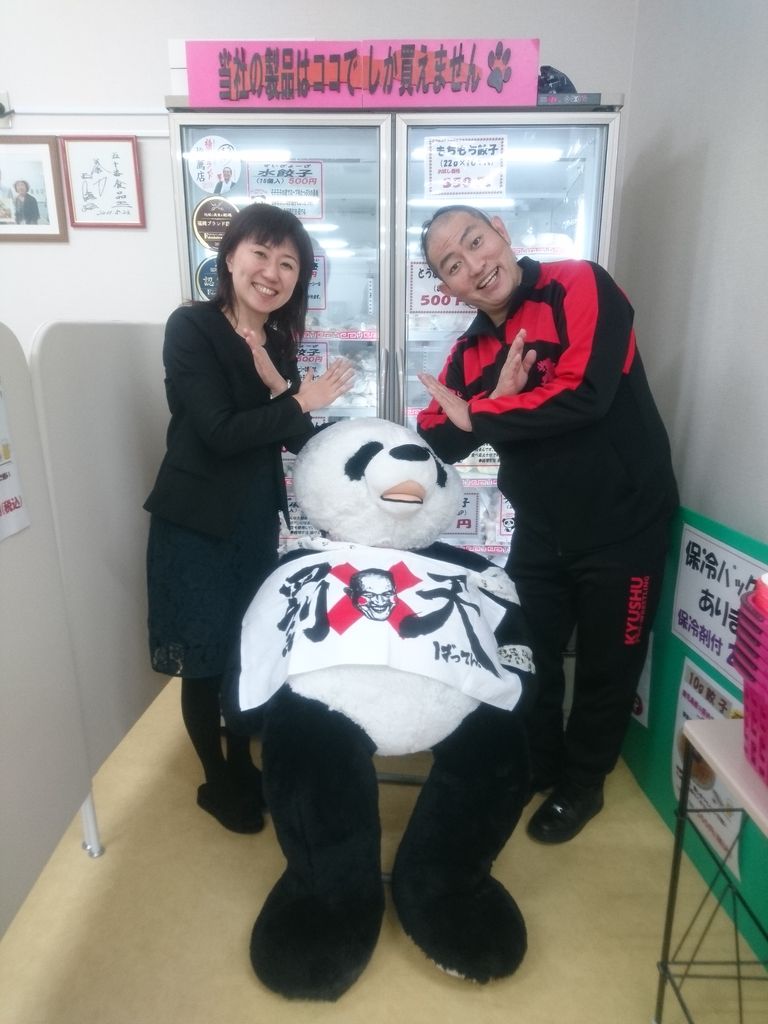 パンダ店長のお腹にのせているのは、ばってんさんの罰天タオル。