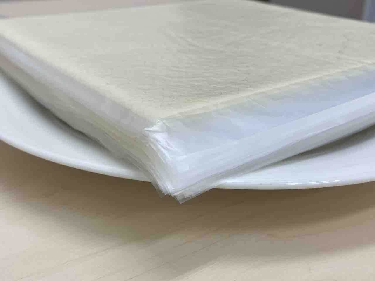五十番食品の通常の春巻皮は、剥がしやすいように間に透明のシートを挟んでいます。