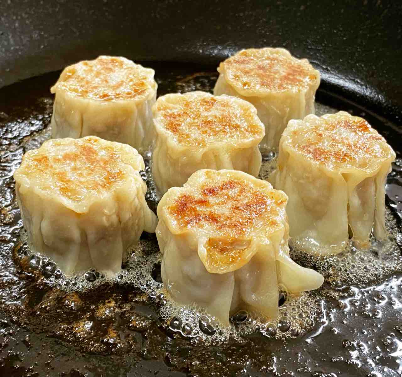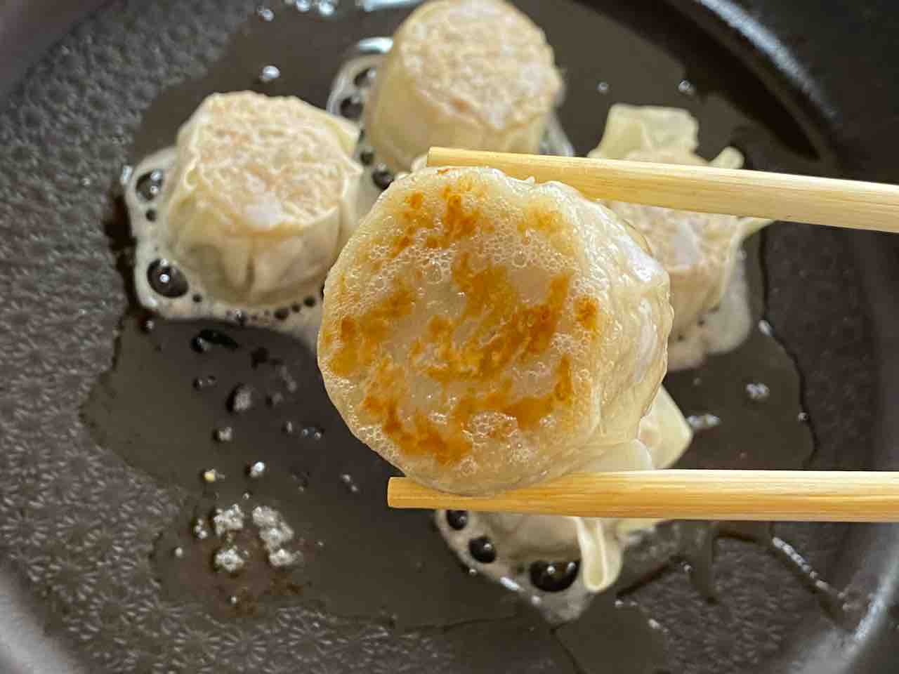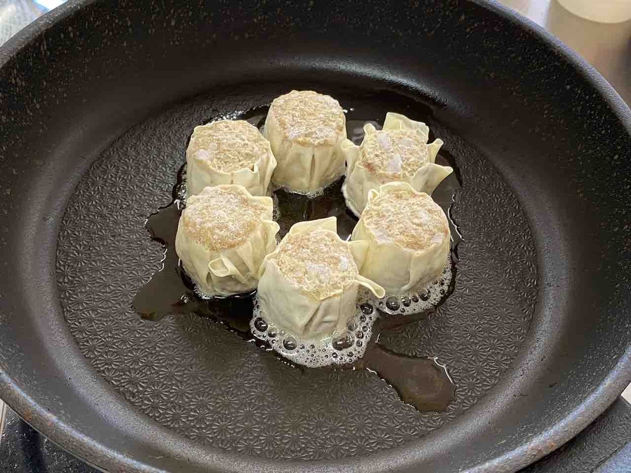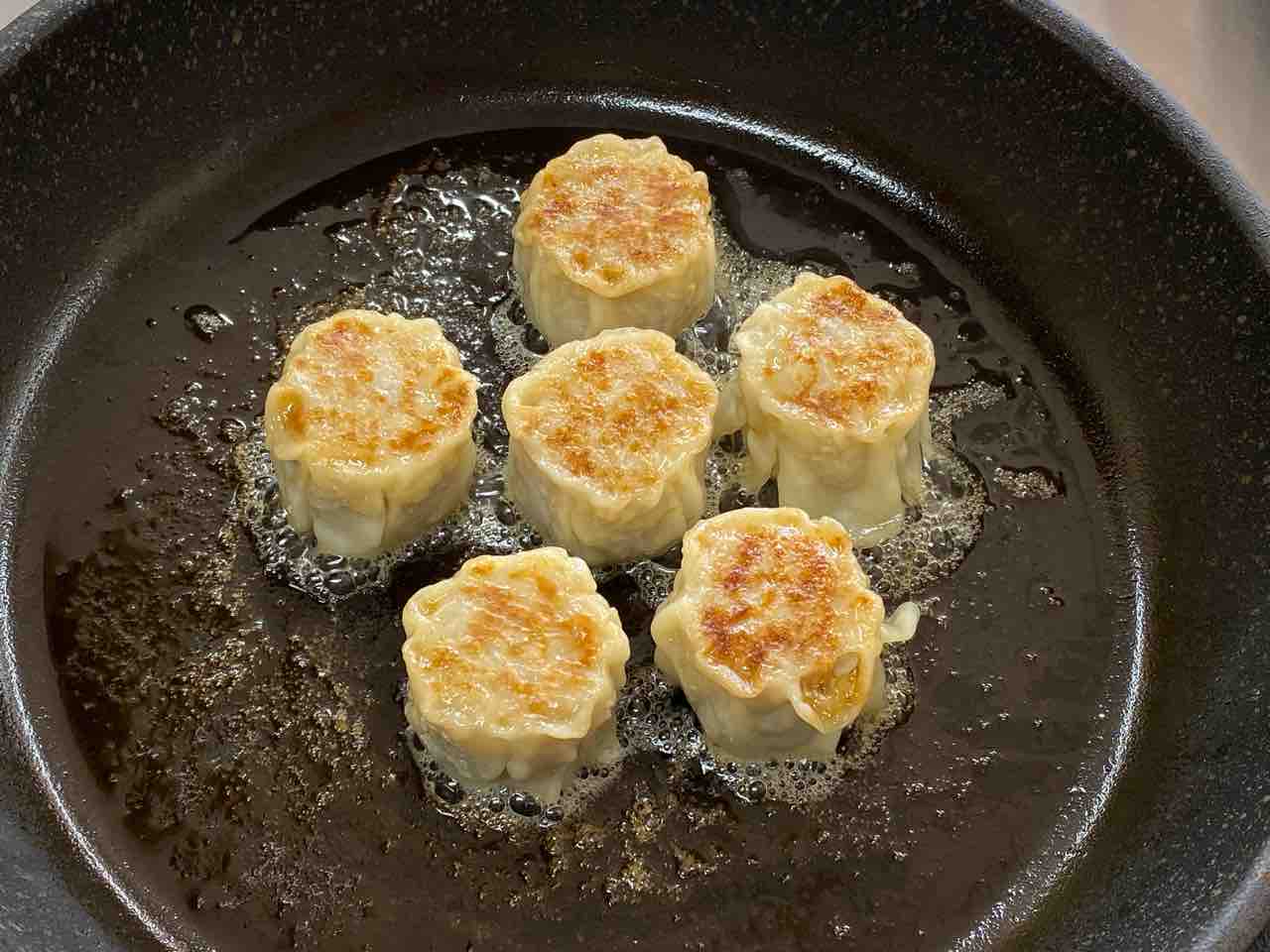 4、裏返して焼売上面にも焼き目をつけます。