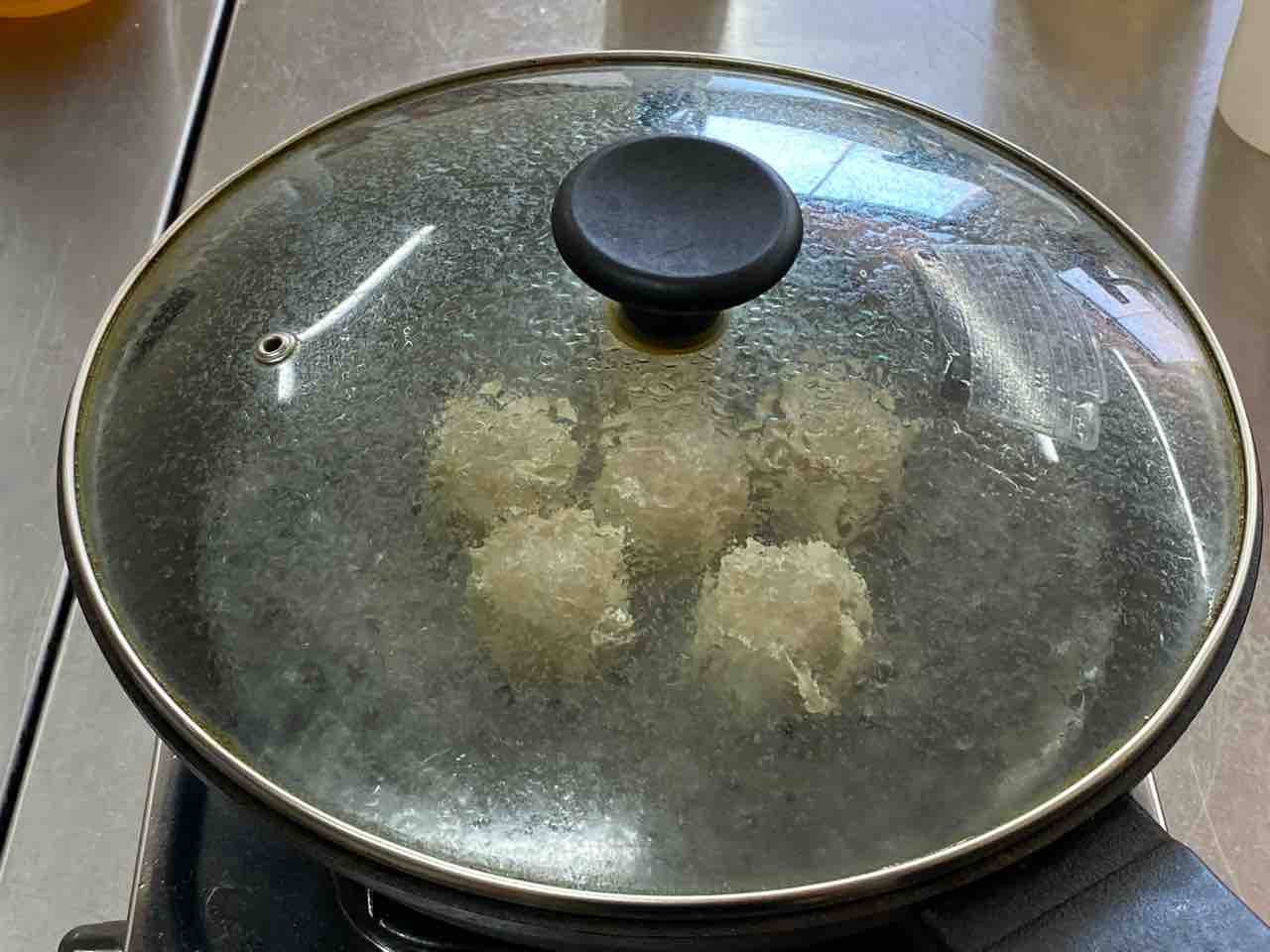 4、フライパンを火にかけて、沸騰したらフタをして10分くらい蒸します。