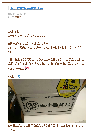 インターネットで「五十番食品」のキーワードで検索していると、「こーちゃんの肉まん」というブログの「五十番食品さんの肉まん」という記事が引っかかりました。