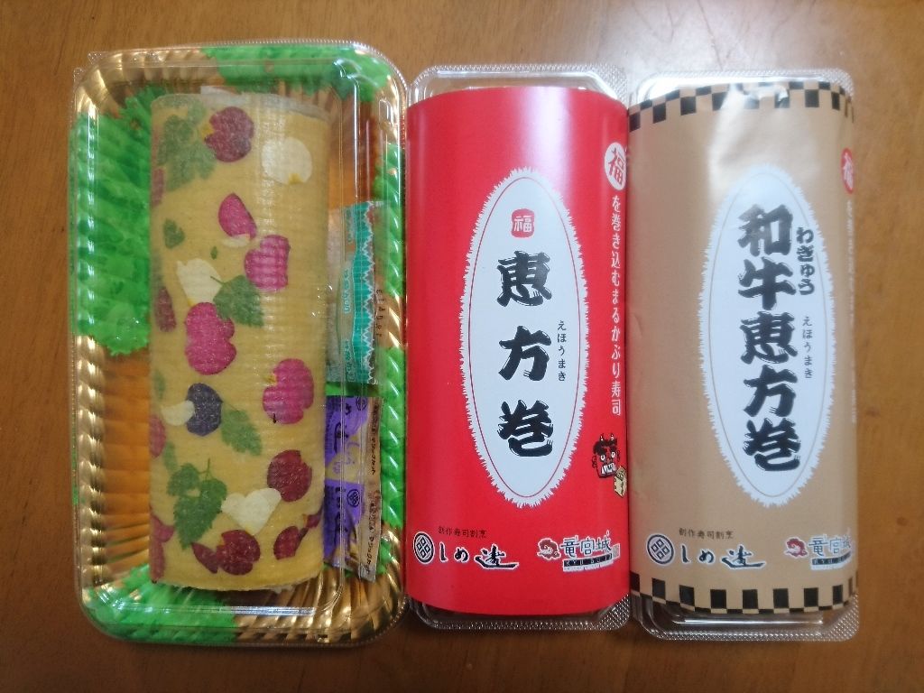 ↑ 右は「和牛恵方巻」、真ん中は普通の「恵方巻」、一番左は・・・ロールケーキ